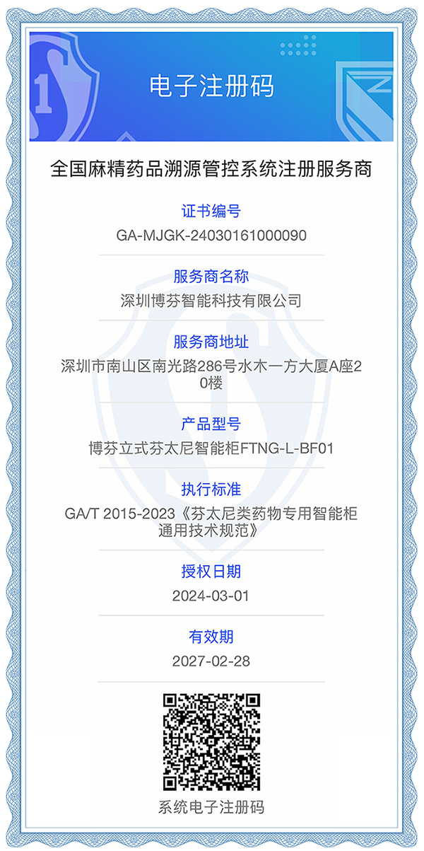 我司成功获得公安部一所颁发的芬太尼类药品柜入网注册许可证,成为全国麻精药品溯源管控系统注册服务商。欢迎各界朋友指导洽谈各项业务,公司将根据不同业务场景研制差异化智能柜,不断迭代开发出更智能化、更贴切临床的芬太尼类药品柜,解决用户管控和使用环节的痛点。
